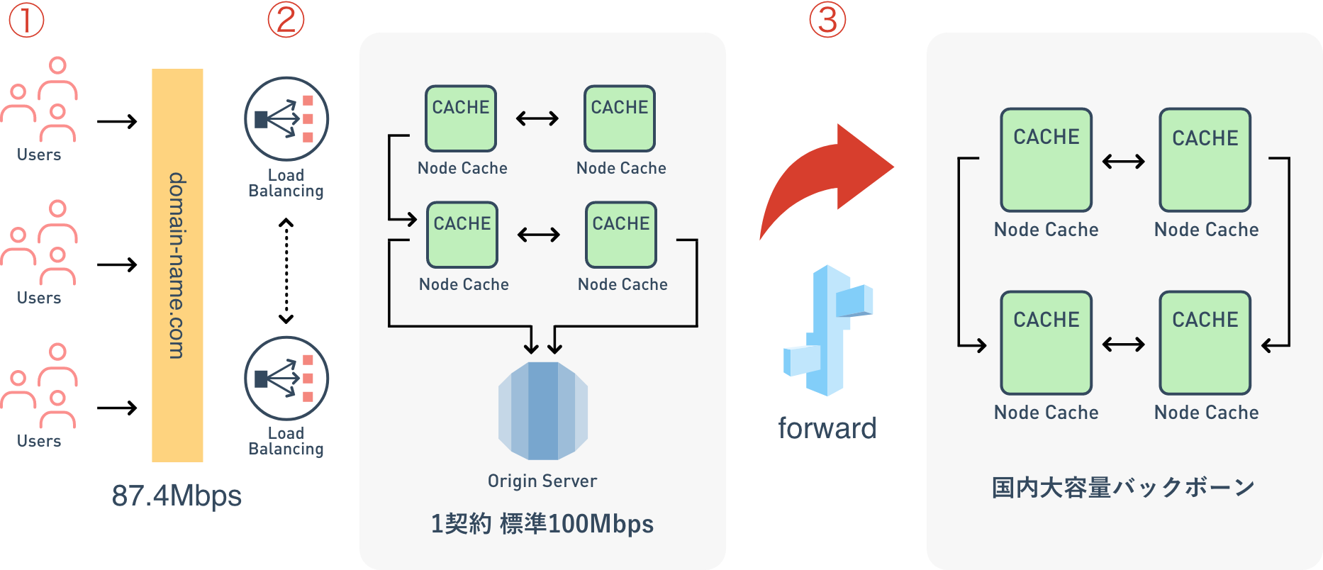 予想が難しい突発的なアクセス時も、国内最大級のバックボーンに直結されたキャッシュサーバーに自動で振り分けを行い、低価格で大規模なアクセスに対応することができるオプションです。