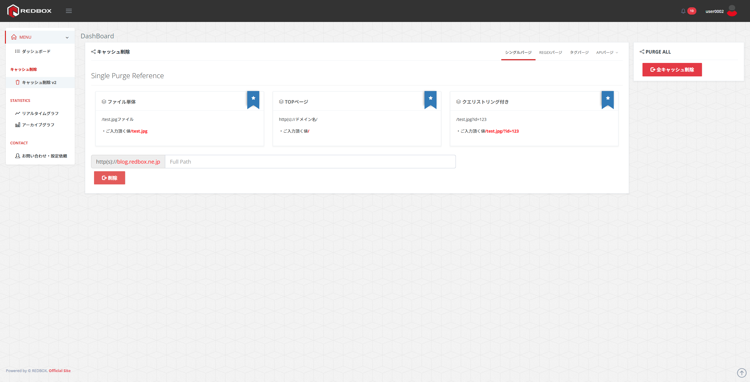 キャッシュ削除は、左メニューバーの「キャッシュ削除」から実行できます。